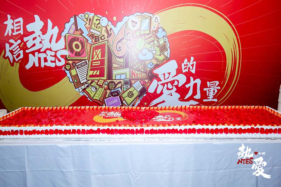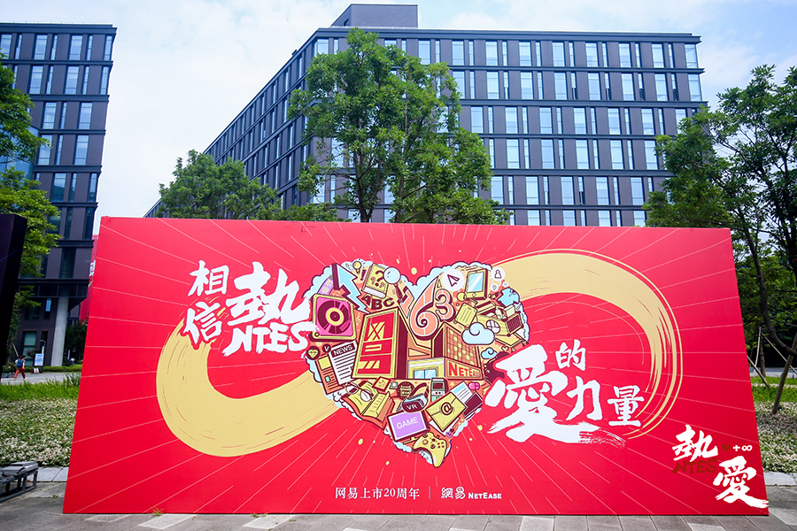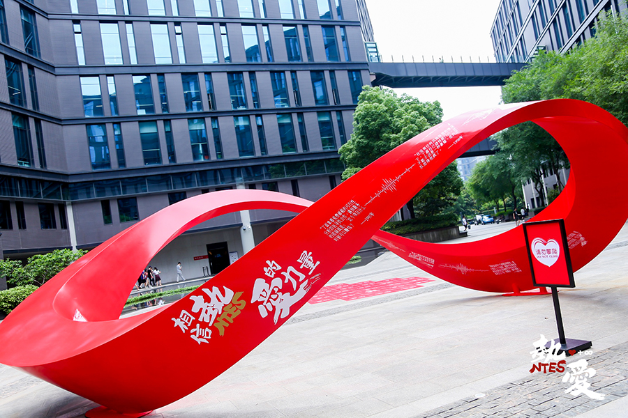其中一大亮點(diǎn)就是將網(wǎng)易20周年大事記做成巨型同心結(jié)造型立于網(wǎng)易大樓前,旁邊點(diǎn)綴心形貼紙?jiān)煨停瑢⒅黝}“相信熱愛的力量”體現(xiàn)得活靈活現(xiàn)。
