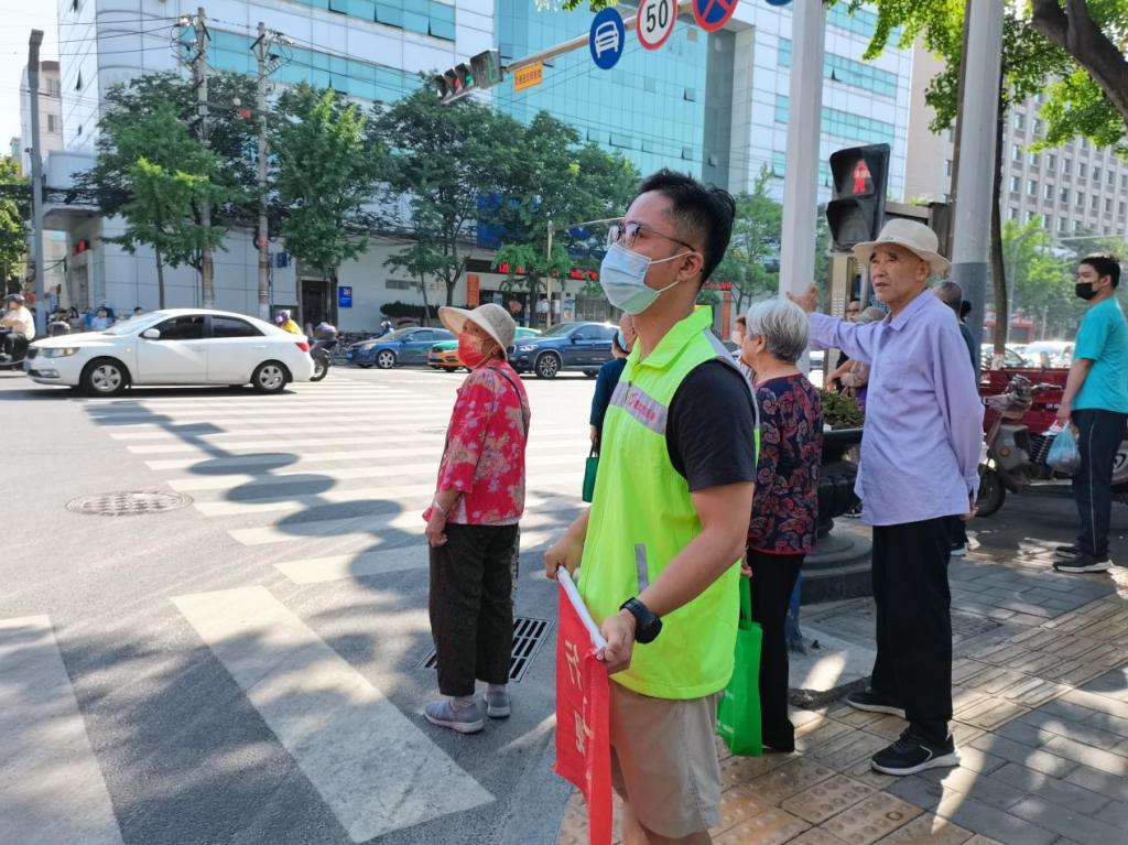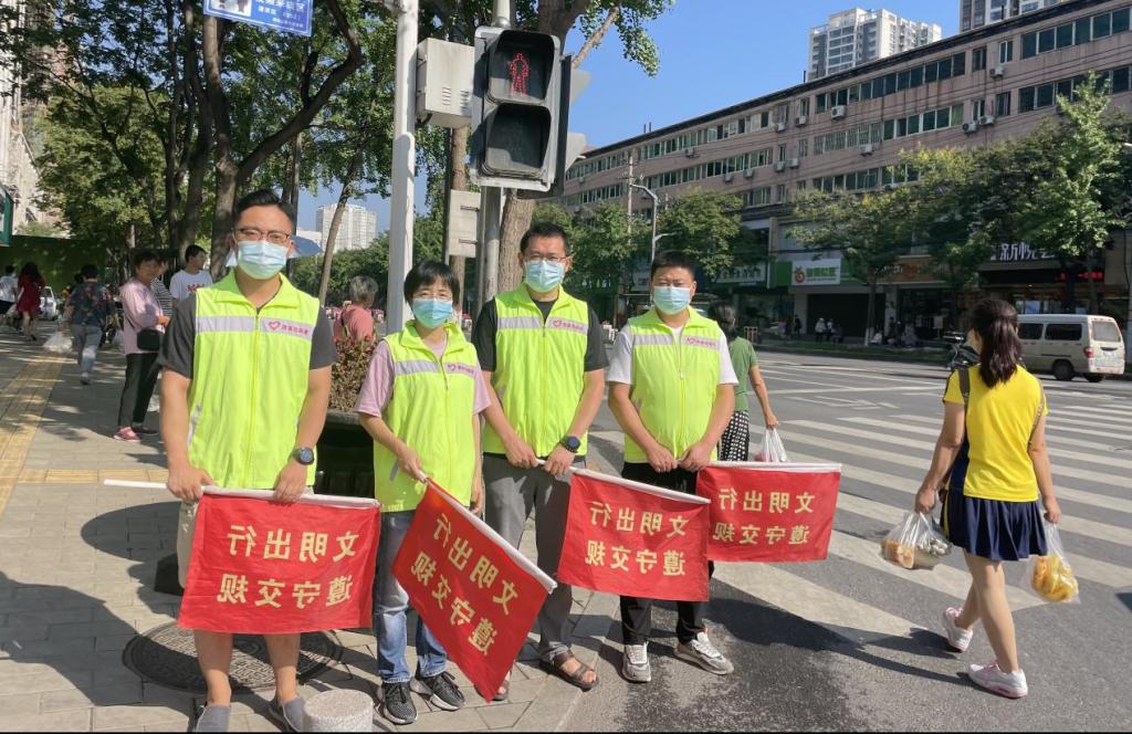頂著炎炎烈日,志愿者身穿“黃馬甲”站在峪泉路和公園路十字路口,及時對行人和非機動車橫穿馬路、亂闖紅燈等不文明交通行為進行勸導,引導其遵章守紀、文明出行,同時還耐心熱情地為需要幫助的行人指路,以實際行動傳遞社會正能量和新時代文明新風尚。